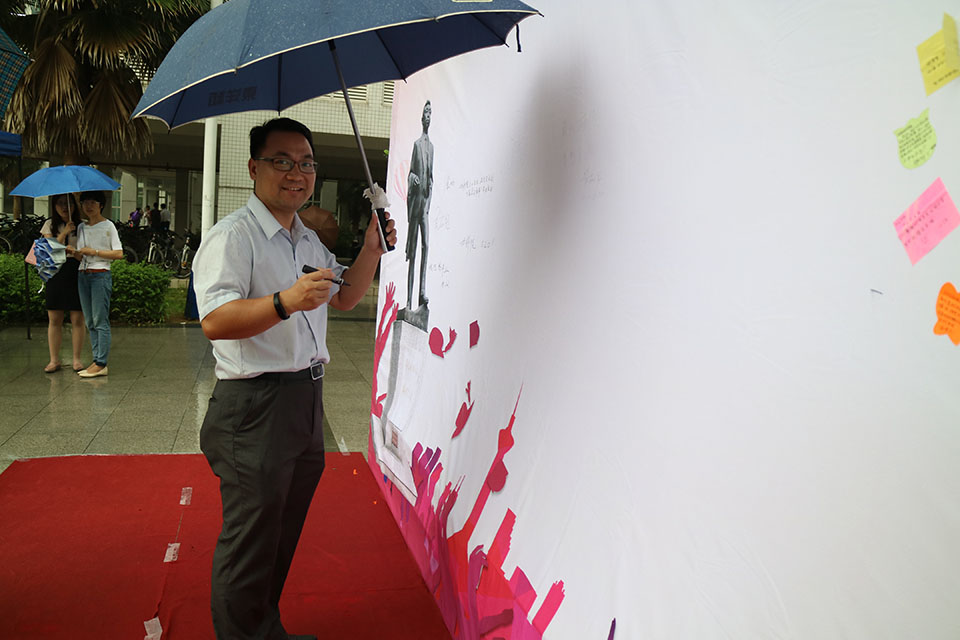 在杨钊杨勋楼和曾宪梓楼中间的广场,一条长长的红地毯和一面以“感恩仲恺情系动科追逐梦想扬帆起航”为主题的签名墙非常醒目。党总支书记曾献尼老师冒雨来到现场,为毕业生送上了“薪薪火相传、梦想成真”的寄语。毕业生们或身着学位服,或正装笔挺,或长裙飘飘,沿着红毯一步一步走到尽头,在签名墙上龙飞凤舞地写上自己姓名,并纷纷拍照留念。