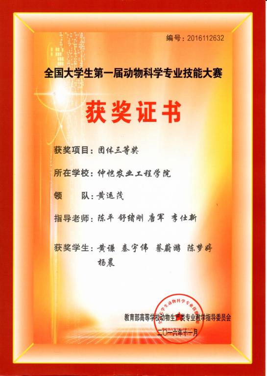 11月26日,在刚刚落幕的第一届全国大学生动物科学专业技能大赛中,伟德bv国际体育学子喜获三等奖。