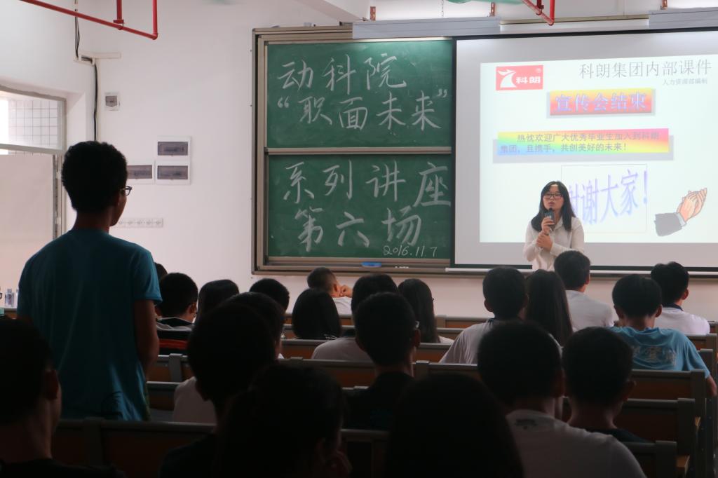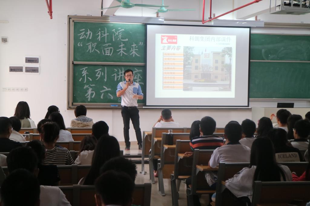 谢瑛妮结合本人的工作经历、成长过程,为同学们作了“你的未来你做主”主题讲座。谢瑛妮是动物科学2008届毕业生,毕业后即通过网络招聘进入科朗集团,从生产线上数鸡苗做起,到今天成为集团高管,成长经历丰富,职业理解透彻。她的分享干货十足、娓娓道来,勉励同学们要把兴趣爱好和专业发展相结合,找到自己未来的发展方向。