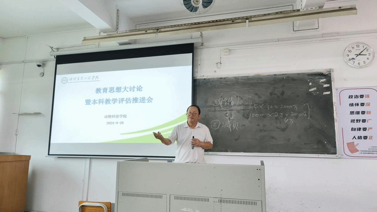 刘文俊副院长首先传达了学校关于全校教育思想大讨论的文件精神,围绕“以立德树人为根本,以强农兴农为己任,确保人才培养中心地位和本科教育教学核心地位”为重点引申,关于本科教育教学审核评估工作的讨论。结合各自分管工作,刘文俊副院长向全体教师总结在学院层面上的审核评估工作部署的进展情况,逐一介绍学院的评建要点、关键策略,以及专家考察走访的关注重点,并提出亟需解决的重点问题及下一步工作安排,强调各专业组、实验中心、教务办、科研办及全体任课教师要积极参与评估工作,严格按照评估要求按时准备相关材料,确保评估工作的顺利进行。