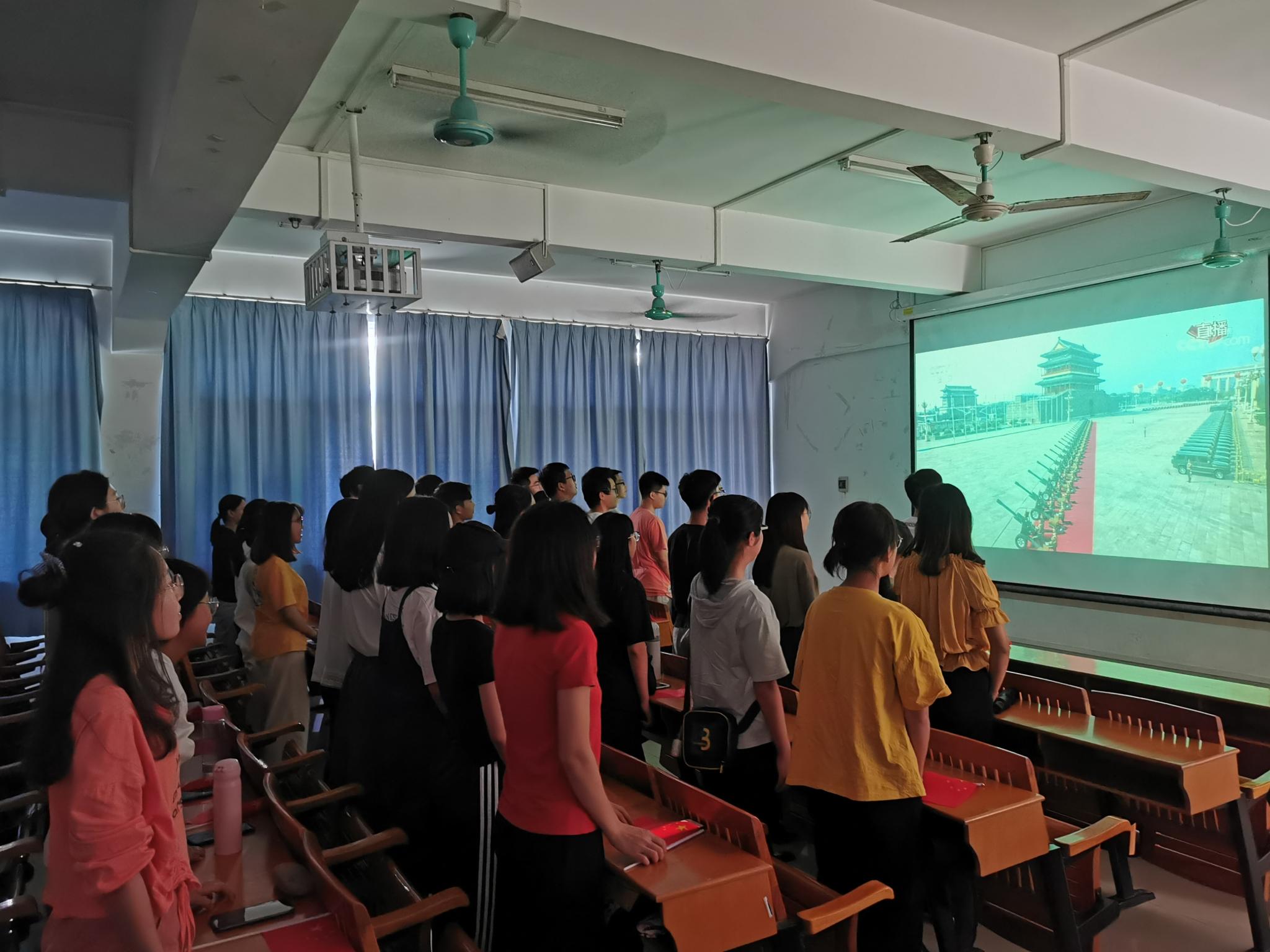 10月1日上午,庆祝中华人民共和国成立70周年大会在北京天安门广场隆重举行,20余万军民以盛大的阅兵仪式和群众游行庆祝中华人民共和国成立70周年。在这举国同庆的日子里,为方便广大在校学生观看国庆系列庆典活动的直播,增强爱国意识,激发爱国情感,伟德bv国际体育组织留校学生在主会场白云校区D2多媒体教室和分会场杨楼206教室集体观看盛大阅兵仪式实况直播。