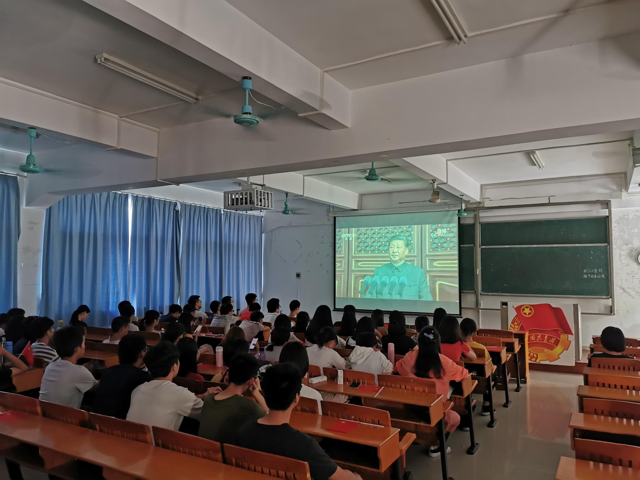 上午九时,学生已早早来到了直播会场。十点钟,56门礼炮72声响彻云霄,一声声巨响让人震撼。在庄严的国歌前奏中,同学们全体起立,注视着国旗冉冉升起,齐唱国歌,深深的自豪感油然而生。全场师生聚精会神聆听习近平总书记重要讲话,纷纷被习近平主席的发言深深感动。