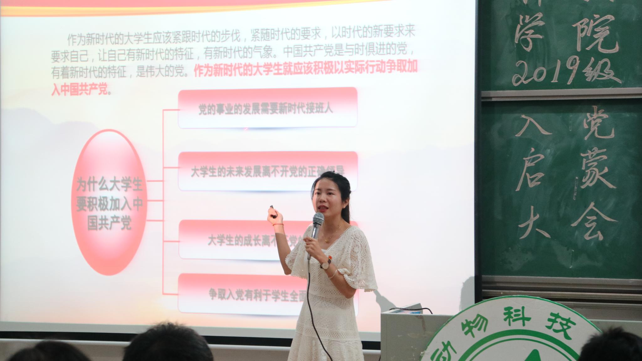 会上,许鸿主要围绕“党的基本知识”、“为什么要加入中国共产党”、“如何入党”以及“入党基本要求和条件”四个部分做了详细的解读。她还同新生分享了自己的入党经历,激励新生积极加入中国共产党,并指出我们要带着一颗“信仰”的心面向党组织,人一旦有了信仰,那么无论前方有多少困难险阻,我们才有足够自信的力量去抵御艰险,面对挫折奋发而上。