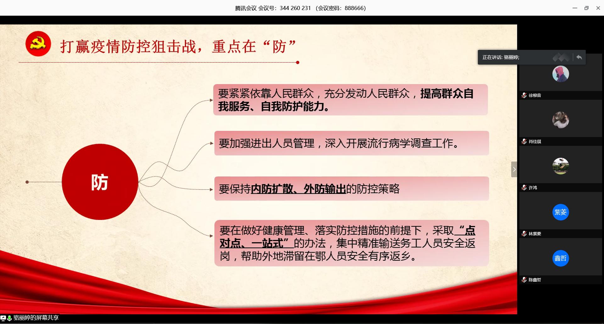 会议上,党小组成员徐柳音、骆丽婷就相关话题进行围绕当前疫情防控形势、防控方向、习近平总书记的讲话内容、考察情况等进行主解。第一,在抗疫前线阵地,实地察看东湖新城社区卫生防疫、社区服务、群众生活保障等情况,并与一线医务人员代表及正在接受治疗的患者进行交流。第二,习近平总书记就当前疫情情况作出指示,强调慎终如始、再接再厉、善作善成,不麻痹、不厌战、不松劲,把患者的生命安全放在第一位,科学防治。第三,习近平总书记强调,要解决好民生问题,做好基层工作,统筹好抗击疫情和复工复产之间的问题。