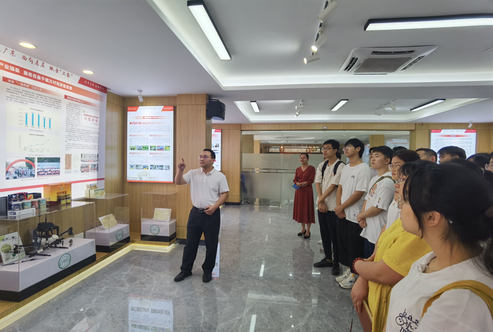 在科技孵化园,曾献尼从学校简介、办学情况、发展目标和乡村振兴四个方面介绍学校的发展情况。他指出学校的建设和发展备受各级领导和社会各界的高度重视与关心,目前学校已发展成为一所以农、工学科为优势,农、工、理、经、管、文、艺、法等多学科协调发展的省属本科大学。学校涌现出众多长期扎根一线服务“三农”的科技特派员,为地方提供优质高效的技术服务,力促地方经济发展,如梁红教授对接广东省和平县现代农业产业园,潜心研究猕猴桃;柳建良教授带领连平县农民种植鹰嘴蜜桃脱贫致富。在这些老师的培养带动下,广大仲恺学子积极投身基层一线,为全面推进广东乡村振兴贡献“仲恺智慧”。他勉励师生党员秉承“注重实践、扶助农工”的校训精神,发挥学科优势,积极投身基层实践,担负起强农兴农的时代责任。