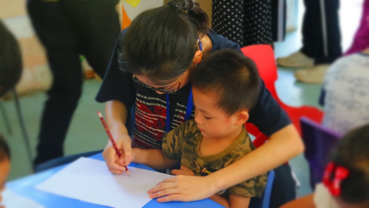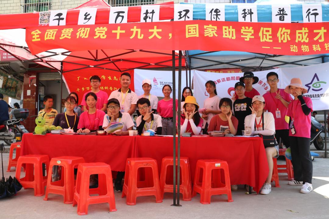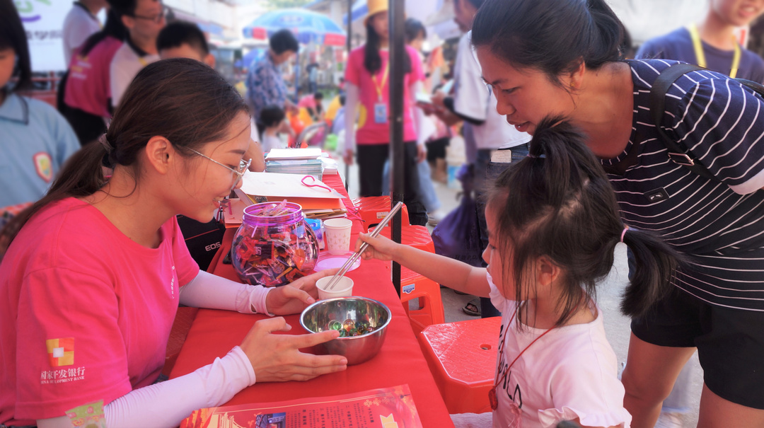 摊位上供孩子游玩的小游戏吸引来许多过往的孩子,且许多村民驻足观望,组员们积极且热情地为过往的村民宣传关于十九大精神、保护生物多样性的相关内容,并向他们讲解了关于“广东省国家助学贷款”的相关政策,并引导其完成调查问卷。