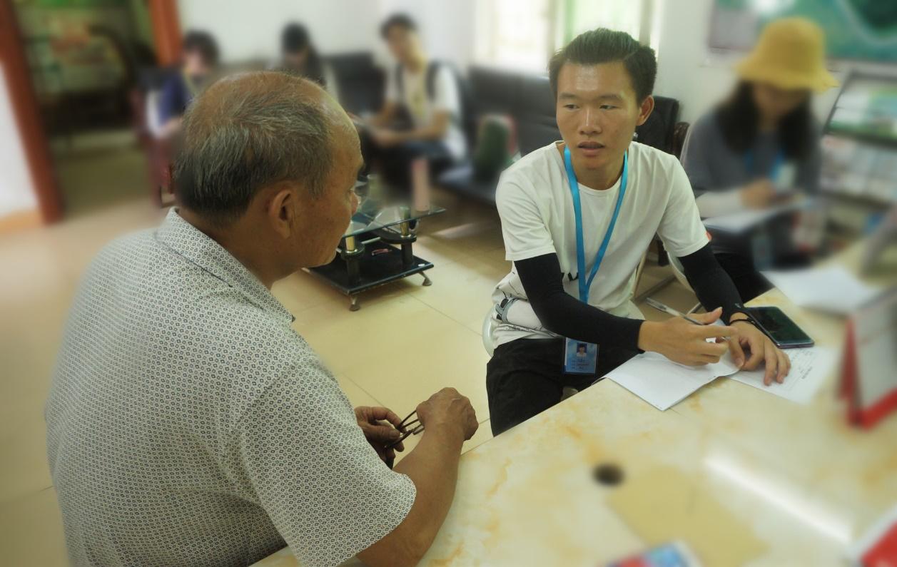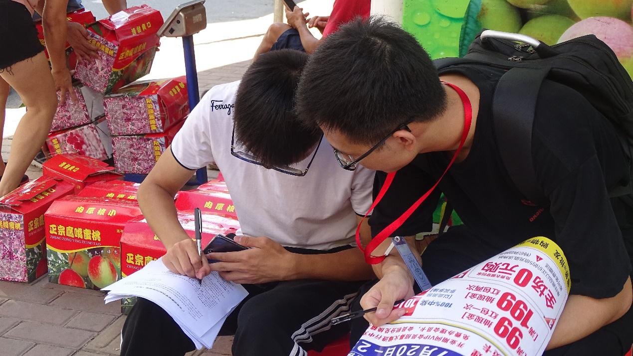 上午8时,调研组、义教组、宣传组同时出发前往各组的目的地开始今天的实践调研活动。调研1组前往乌石岗村许屋坝和军屯村进行有关“乡村基础教育情况及存在问题”问卷调查,组员们穿行于阡陌交通的乡间,挨家挨户进行访问。当地居民十分热情好客,待人亲切,他们积极地完成问卷并对乡村教育问题提出建议。调研1组还到乌石岗村党群服务中心进行有关“乡村振兴”和“乡村基础教育”的访谈,组员们了解到乌石岗村近几年的扶贫情况和发展方向,同时了解到当地目前的基础教育情况和存在的一些问题。而调研2组则前往新丰县进行调研、访谈活动。调研过程中,有幸遇到伟德bv国际体育13届毕业生曾师兄并对其进行了有关国家出台“乡村振兴”政策的访谈,组员们收获了曾师兄对这一相关问题比较全面的回答。尽管烈日炎炎,暑气蒸人,调研组的组员们浑身被汗水浸湿,但每一位组员不辞辛苦、毫不懈怠,都抱着对调研的热情,认真做好每一次的问卷调查和每一次访谈。