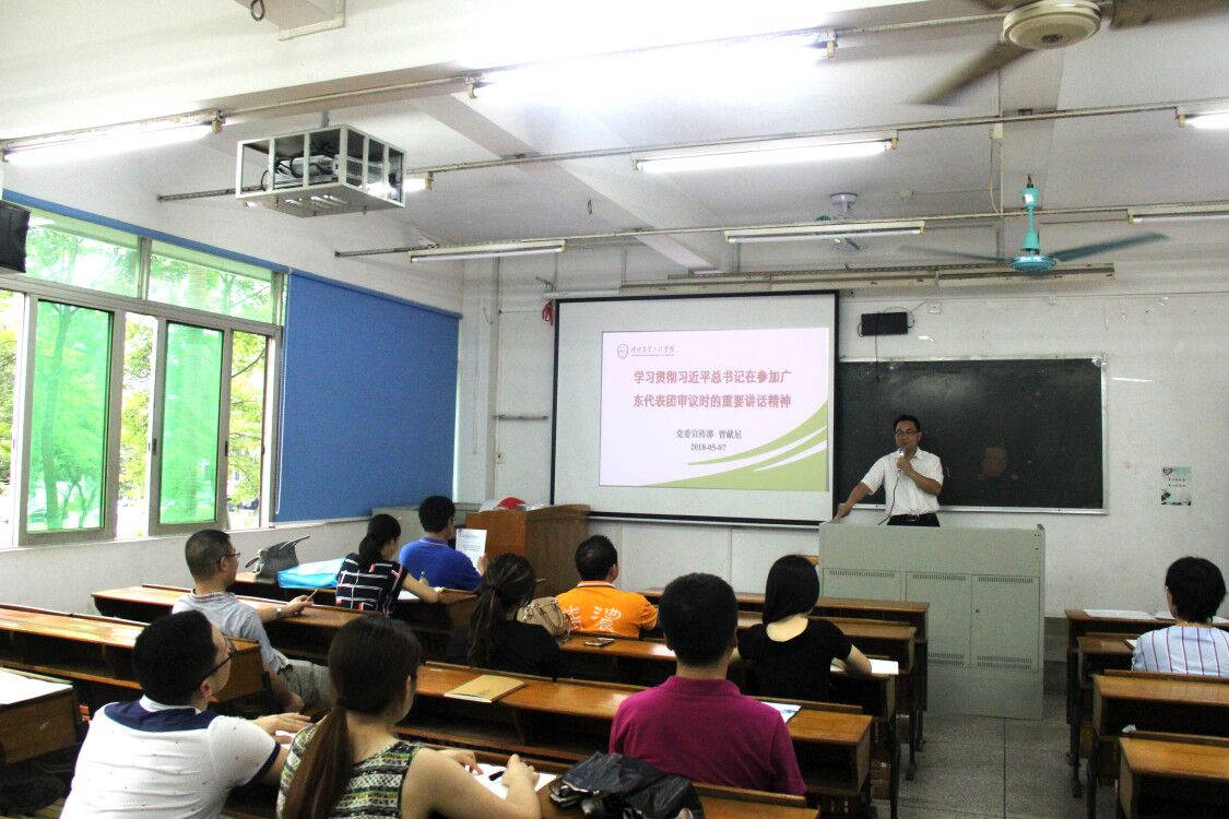 根据学校再学习再领会习近平总书记重要讲话精神的通知要求, 5月17日下午,伟德bv国际体育在海珠校区教学楼203室举行专题辅导报告会。学校党委宣传部部长,宣讲团成员曾献尼应邀就“学习贯彻习近平总书记在参加十三届全国人大一次会议广东代表团审议时的重要讲话精神”为主题作辅导报告。报告会由伟德bv国际体育党总支书记欧坚泉主持,学院全体教工党员到场聆听。
