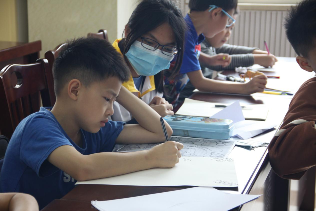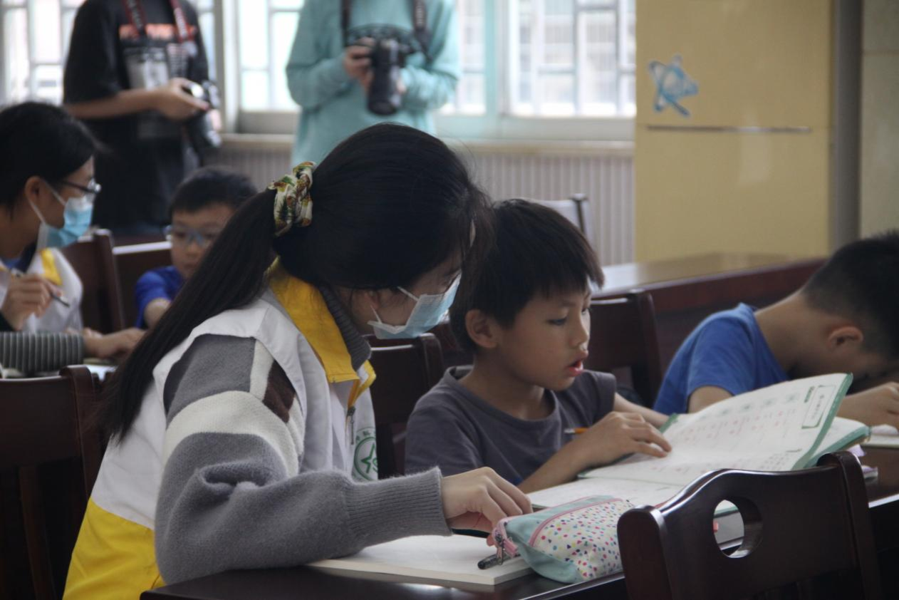 首先进行的是小朋友们的作业辅导。志愿者们帮小朋友们排好座位后,便穿行在小朋友们之间。每当小朋友们提出问题,志愿者们都能顺利帮助他们思考并解决问题。在志愿者们的帮助下,小朋友们都顺利地完成了自己的作业。