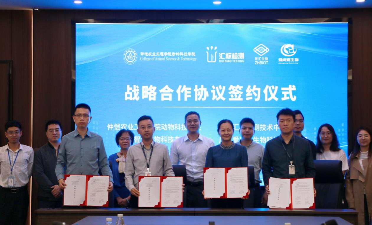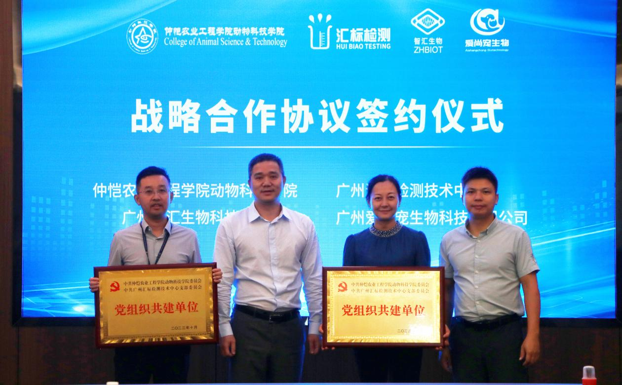 朱路平代表伟德bv国际体育与广州汇标检测技术中心、广州智汇生物科技有限公司、广州爱尚宠生物科技有限公司共同签署了战略合作协议,并与广州汇标检测技术中心党支部书记李丰互授“党组织共建单位”牌匾。