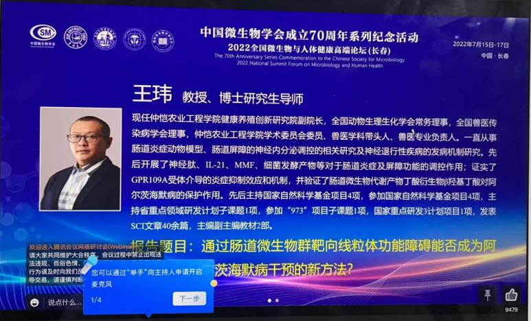 7月15日至17日,在中国微生物学会成立70周年之际,由中国微生物学会医学微生物学与免疫学专业委员会、吉林大学基础医学院及上海交通大学医学院全球健康学院共同主办,国际老年医学杂志社承办的2022全国微生物与人体健康高端论坛在吉林大学基础医学院举办。伟德官网伟德bv国际体育动物医学系王玮教授受邀线上做大会报告分享了最新的研究进展。